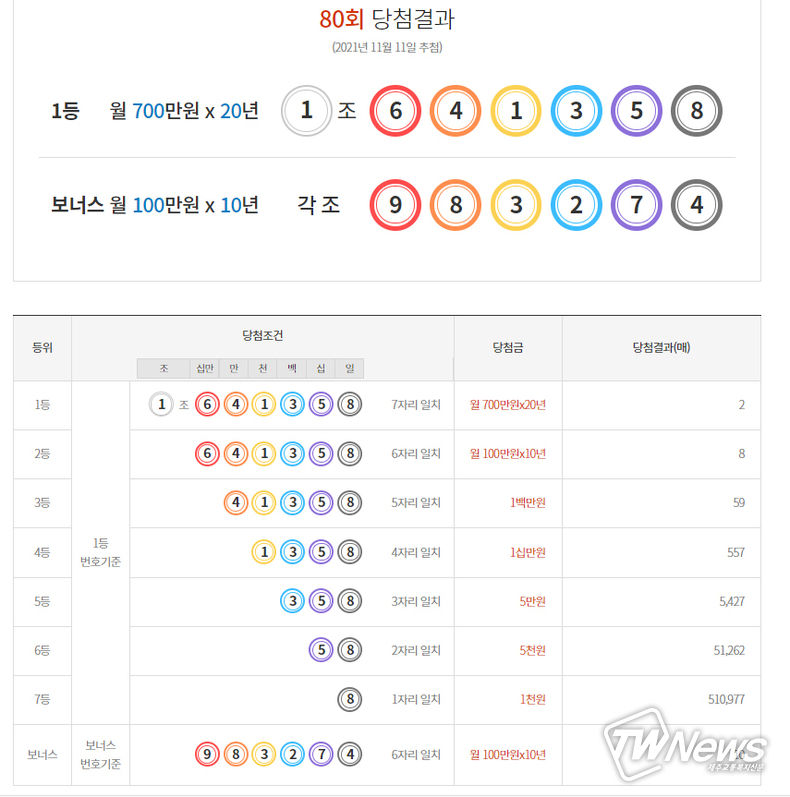 [제주교통복지신문 최효열 기자] 지난주 연금복권720+당첨확인 80회차 1등 당첨번호는 " 1조641358 "이다. 보너스번호는 " 각조983274 "이다.