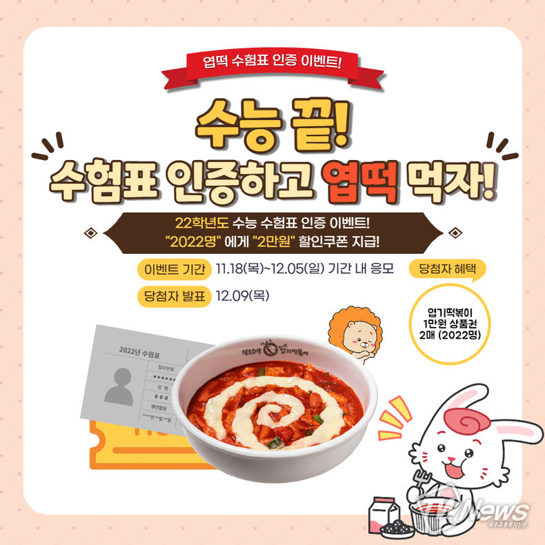 정상적으로 수험표를 인증한 참여자 중 2022명을 랜덤으로 추첨하여 엽기떡볶이 할인쿠폰을 제공한다.