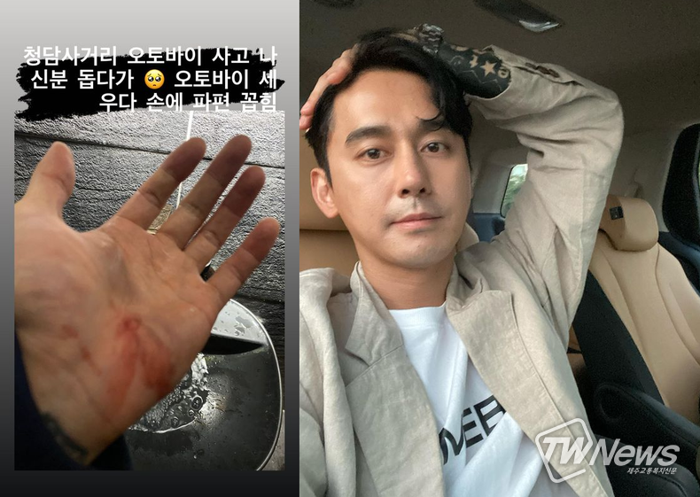 김상혁은 사진에다 “청담사거리 오토바이 사고 나신 분 돕다가. 오토바이 세우다 파편 꼽힘”이라는 글을 적었다.