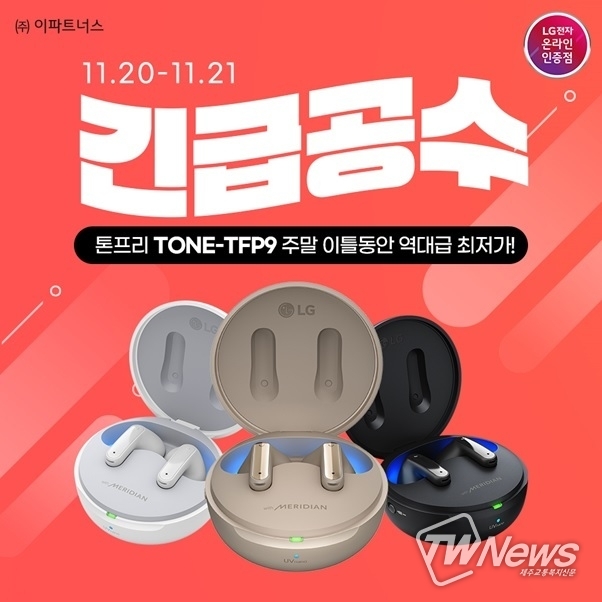 [제주교통복지신문 신혜정 기자] LG전자 공식 전문점 ‘이파트너스’가 11번가를 통해 LG블루투스이어폰 톤프리 TONE-TFP9 제품에 대해 기간 한정 이벤트를 진행한다고 밝혔다.