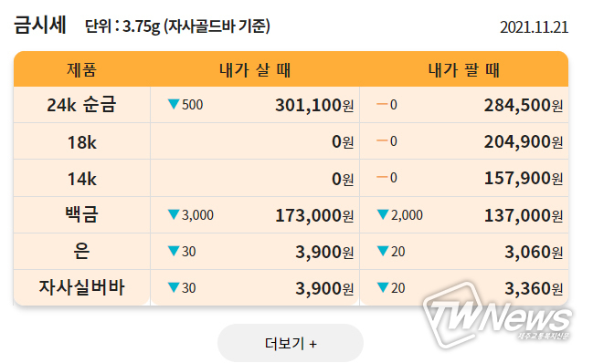 [제주교통복지신문 최효열 기자] 11월 21일 일요일 0시 기준, 한국표준금거래소에 따르면 순금 1돈(Gold24k-3.75)은 30만 1,100원에 구입 가능하다.
