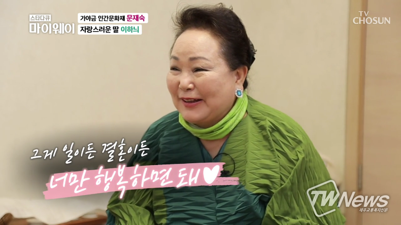 21일 오후 방송된 TV조선 ‘스타다큐 마이웨이’에서는 국가무형문화재 제23호 문재숙 명인의 모습이 그려졌다. 가야금산조·병창 예능 보유자인 문재숙 명인은 이날 방송에서 가족과 인생 이야기를 전하며, 딸 이하늬와도 만나 대화를 나눴다.
