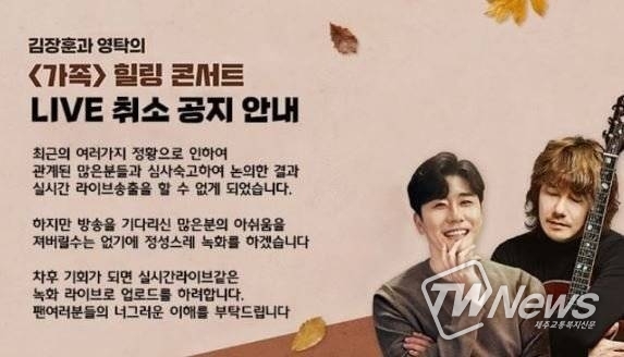 21일 공연 주최 측은 ‘김장훈과 영탁의 '가족' 힐링 콘서트 라이브 취소 공지 안내’라는 공지를 전했다.