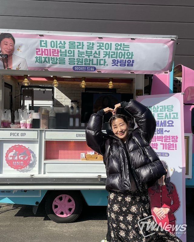 공개된 사진에는 배우 유아인이 응원을 위해 보낸 커피차의 모습이 담겼다. 라미란은 그 앞에서 양팔로 하트 모양을 만들어 보이며 감사를 표하고 있다. 커피차 현수막에 적힌 ‘더 이상 올라 갈 곳이 없는 라미란 님의 눈부신 커리어와 체지방을 응원합니다’라는 문구가 눈에 띈다.