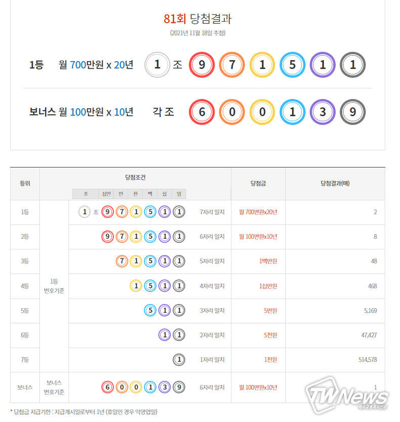 [제주교통복지신문 최효열 기자] 지난주 연금복권720+당첨확인 81회차 1등 당첨번호는 " 1조971511"이다. 보너스번호는 " 각조 600139 "이다.