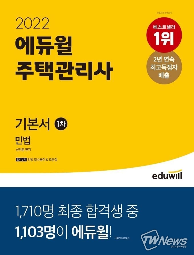 [제주교통복지신문 전희연 기자] 종합교육기업 에듀윌(대표 박명규) 주택관리사는 ‘2022 에듀윌 주택관리사 1차 기본서 민법’ 교재가 온라인서점 예스24 주택관리사 부문 11월 월별 베스트셀러 1위에 올랐다고 24일 밝혔다.