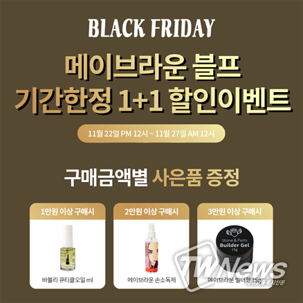 [제주교통복지신문 신혜정 기자] 젤네일 전문브랜드 메이브라운(MEIBROWN,대표 박미성)이 1년에 단 한번 진행하는 블랙프라이데이를 맞이해 22일부터 27일까지 자사 메이브라운 네이버스토어팜에서 할인행사를 진행 중이라고 밝혔다.