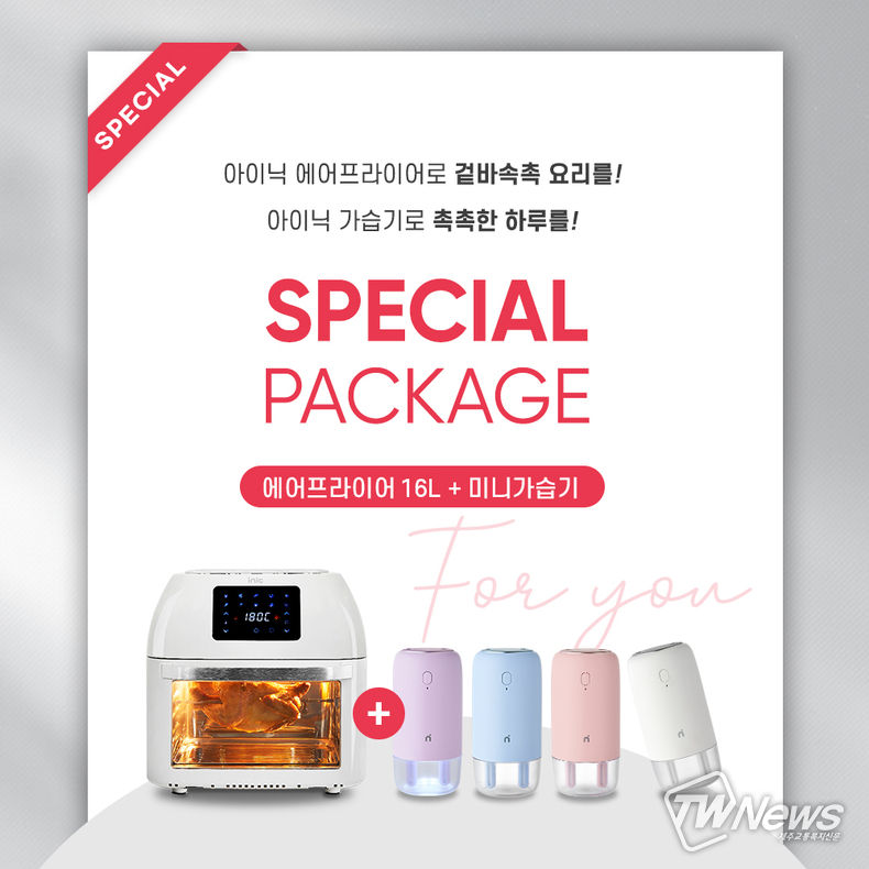 또한 해당 프로모션에서는 아이닉의 대용량 스텐 에어프라이어와 미니가습기를 패키지로 구성하여 특별한 할인가로 만나볼 수 있다.
