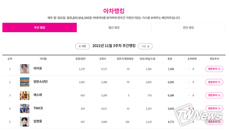 지난 27일 발표된 아이돌차트 11월 3주차(21.11.15~21.11.21) 아차 랭킹에 따르면 가수 아이유가 가장 높은 점수를 기록해 1위를 차지했다. 아이유는 음원점수 1178점, 유튜브 점수 4727점, 소셜점수 1381점 등 총점 7356점을 기록했다.