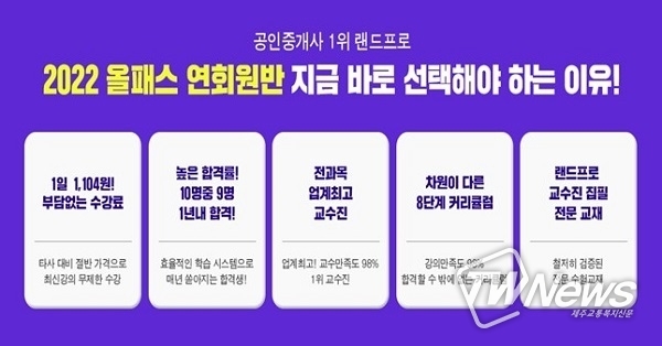 [제주교통복지신문 신혜정 기자] 공인중개사 교육 브랜드 랜드프로가 ‘2022 공인중개사 올패스 연회원반’ 수강생을 모집하며 입문서 교재 무료배포 이벤트를 선보였다.