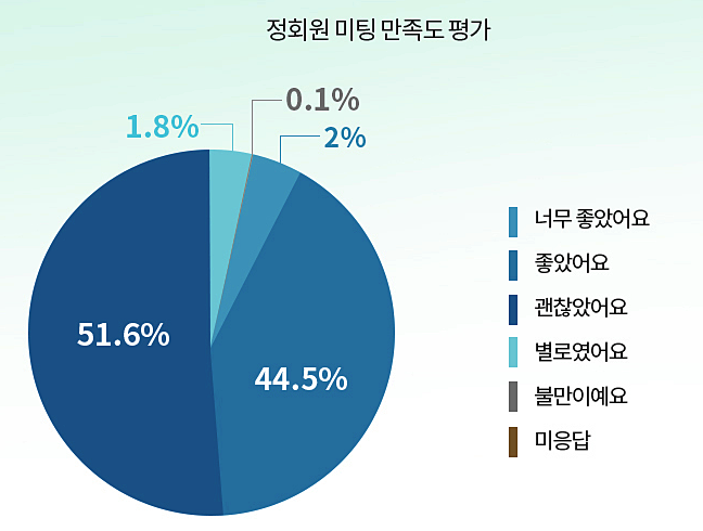 그 결과 ‘기대 만족도’ 부분의 경우 가입 상담 부문(가입 프로그램, 활동, 신원인증, 성혼비 안내)에서 ▲전문성 82% ▲친절성 91%로 평균 86.5%를 기록했으며, ‘이용 만족도’는 ▲너무 좋았어요 7.8% ▲좋았어요 38.6% ▲괜찮았어요 48.8% ▲별로였어요 4.4% ▲불만이에요 0.4%로 나와 95.2%가 긍정적인 답변을 한 것으로 나타났다.