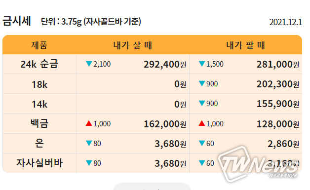 [제주교통복지신문 최효열 기자] 12월1일 수요일 0시 기준, 한국표준금거래소에 따르면 순금 1돈(Gold24k-3.75)은 29만 2,400원에 구입 가능하다.