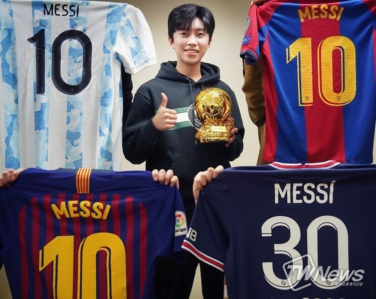 공개된 사진 속에는 메시의 이름이 적힌 여러 유니폼을 인증하며 엄지를 치켜든 임영웅의 모습이 담겼다. 다른 한 손에는 발랑도르 트로피와 비슷한 트로피를 들고 있다.