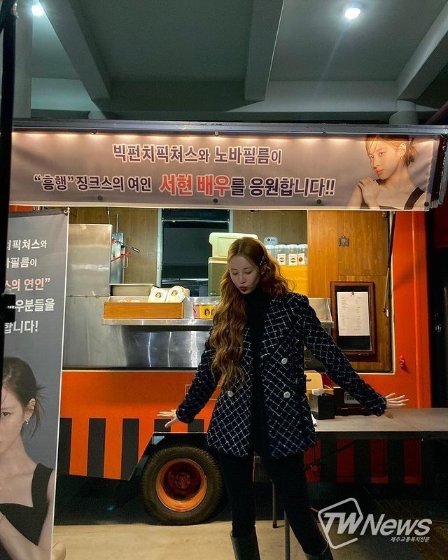 공개된 사진 속에는 ‘징크스의 연인’을 중인 서현 앞으로 온 커피차의 모습이 담겼다. 커피차의 현수막에는 “빅펀치픽쳐스와 노바필름이 ‘흥행’ 징크스의 여인 서현 배우를 응원합니다”라고 적혀있으며, 배너에는 “빅펀치픽쳐스와 노바필름이 징크스의 연인 스탭 및 배우분들을 응원합니다”라고 적혀있다. 이에 서현은 감사를 표하기 위해 커피차 앞에서 각종 자세를 선보이면서 인증샷을 찍었다.
