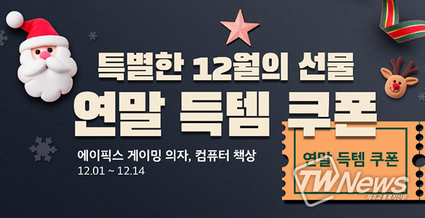이번 이벤트는 에이픽스 공식 온라인몰에서 컴퓨터의자/게이밍데스크에 적용해 사용할 수 있는 연말 득템 쿠폰을 제공한다. 연말 득템 쿠폰은 최대 3만 원까지 할인 혜택을 제공한다.