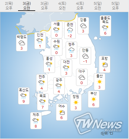 (3일) 아침최저기온은 서울 0도, 인천 1도, 수원 0도 등 -4~1도, 낮최고기온은 서울 4도, 인천 4도, 수원 5도 등 3~5도가 되겠다.