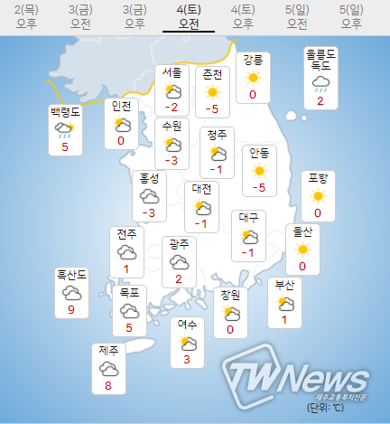 (4일) 아침최저기온은 서울 -2도, 인천 0도, 수원 -3도 등 -7~0도, 낮최고기온은 서울 6도, 인천 6도, 수원 7도 등 5~8도가 되겠다.