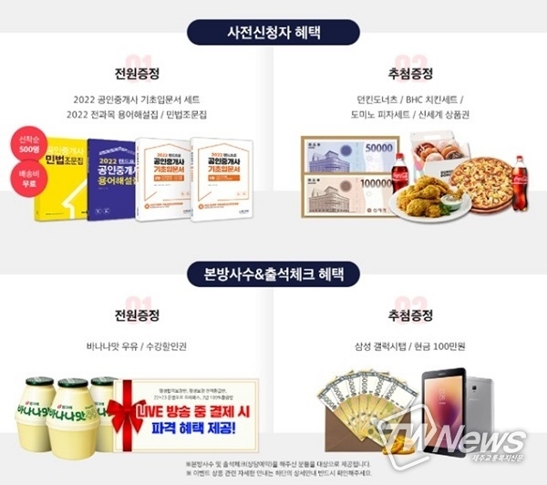 본방사수 및 출석체크를 한 수험생에게 바나나맛 우유를, 랜드프로 인강 패키지(평생합격보장반 등) 관련 상담 예약을 남긴 수험생에 한해 파격 혜택을 제공한다. 추첨을 통해 삼성 갤럭시 탭과 현금 100만원을, 사전 질문을 등록한 수험생에 한해 추첨을 통해 스타벅스 아메리카노도 지급한다.