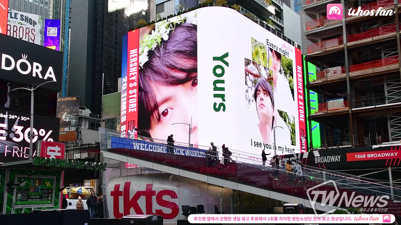 지난 2020년에도 방탄소년단 진은 후즈팬 1위를 차지하며 뉴욕 타임스 스퀘어 전광판 생일 광고가 송출된 바 있다. 후즈팬에서는 생일을 맞는 케이팝 아티스트들을 위해 뉴욕 타임스퀘어 대형 전광판 광고 구좌를 놓고 매주 글로벌 팬들의 투표를 받고 있다.