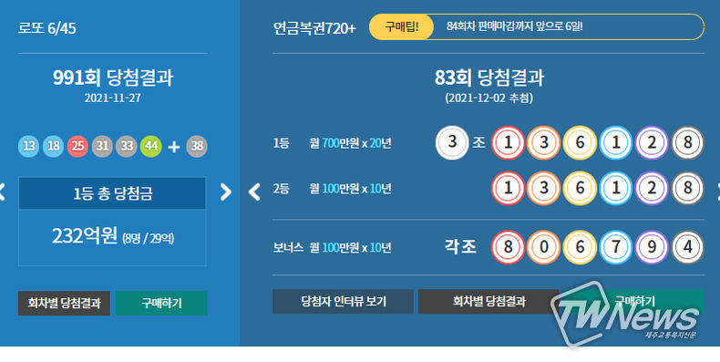지난주 83회차 1등 당첨번호는 " 3조136128 "이다. 보너스번호는 " 각조 806794 "이다.