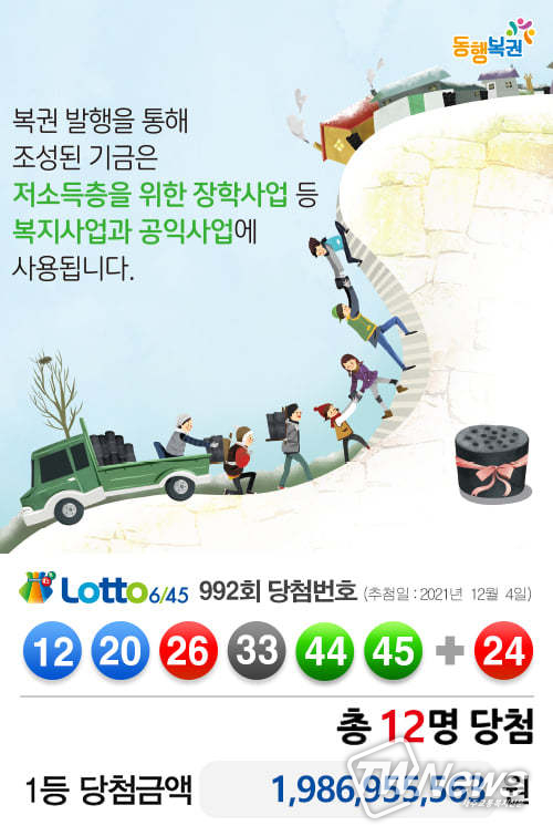 [제주교통복지신문 최효열 기자] 992회 로또 1등당첨번호조회는 " 20, 33, 45, 26, 12, 44 "이다. 2등 보너스번호는 " 24 "이다.