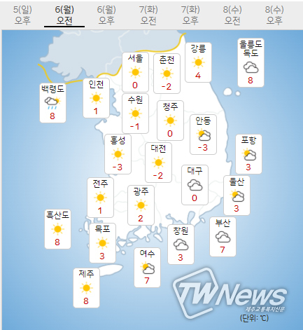 (6일) 아침최저기온은 서울 0도, 인천 1도, 수원 -1도 등 -6~1도, 낮최고기온은 서울 11도, 인천 10도, 수원11도 등 9~11도가 되겠다.