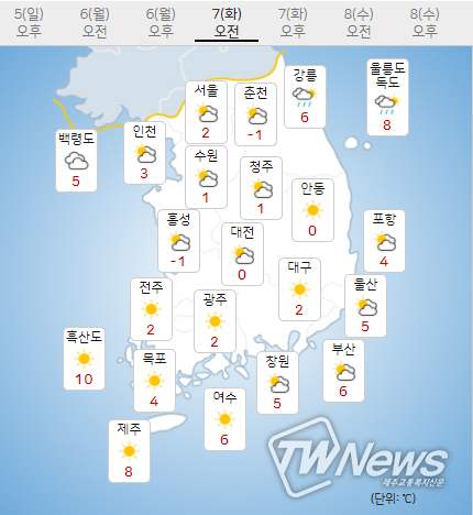 (7일) 아침최저기온은 서울 2도, 인천 3도, 수원 1도 등 -2~3도, 낮최고기온은 서울 12도, 인천 11도, 수원13도 등 11~13도가 되겠다.