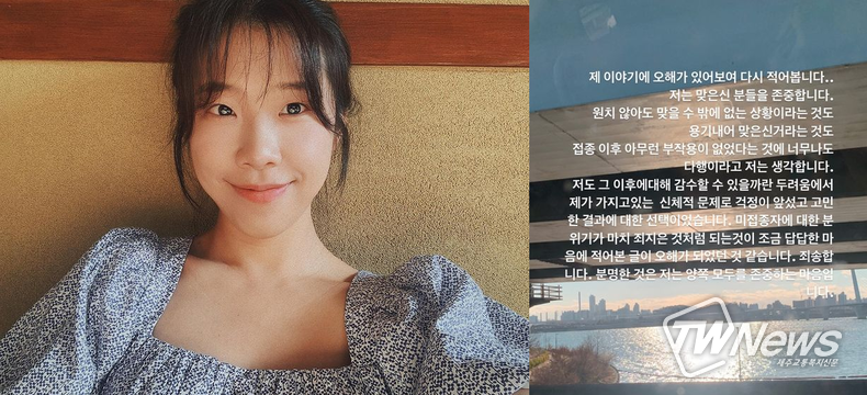 이어 “저도 그 이후에 대해 감수할 수 있을까란 두려움에서 제가 가지고 있는 신체적 문제로 걱정이 앞섰고, 고민한 결과에 대한 선택이었다”라며 “미접종자에 대한 분위기가 마치 죄지은 것처럼 되는 것이 조금 답답한 마음에 적어본 글이 오해가 됐던 것 같다”라고 설명했다.