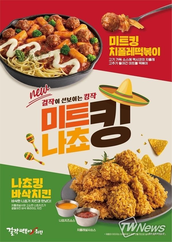 [제주교통복지신문 신혜정 기자] 걸작떡볶이치킨이 새로운 메뉴를 선보인다고 밝혔다. 이번 신메뉴 2종은 멕시코를 연상시키는 '미트킹치폴레떡볶이'와 '나쵸킹바삭치킨'의 조합이다.