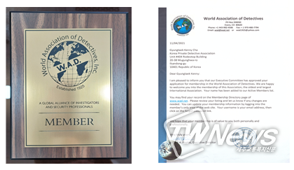 한편, WAD(세계탐정협회)는, KPDA(대한탐정연합회)에 대한 경력심사를 거쳐, 한국 최초의 WAD 가입 승인을 결정하고, 지난 10월 30일 KPDA(해외총괄본부)에 공식 통보해 왔다.