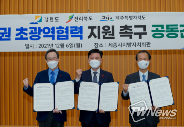 제주도는 6일 오후 4시 세종시 지방자치회관에서 강원도·전라북도와 공동으로 ‘강소권 초광역협력 지원 촉구 공동건의문’을 발표했다.
