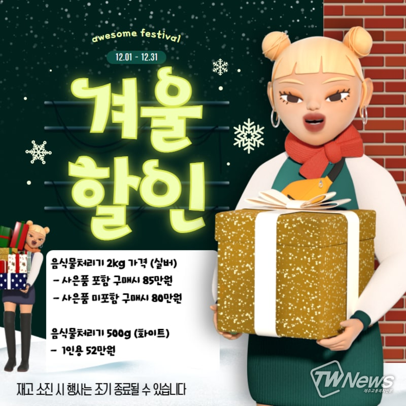 [제주교통복지신문 신혜정 기자] 지엘 음식물 처리기를 판매하고 있는 어썸스퀘어에서 현재 진행 중인 어썸페스티벌 할인 이벤트를 오는 31일까지 연장한다고 밝혔다.
