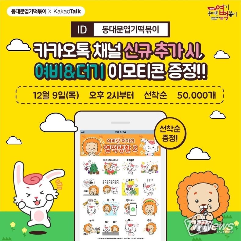이번 이벤트는 오늘(9일) 오후 2시부터 선착순 5만명을 대상으로 진행하며, 동대문엽기떡볶이 카카오 플러스 신규 친구 대상으로 진행된다.