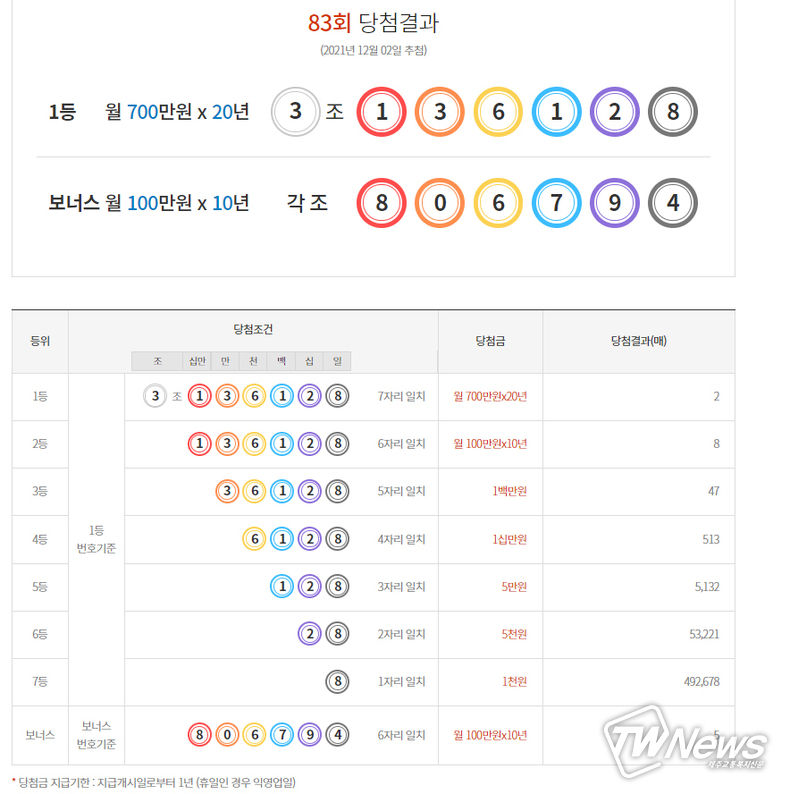 [제주교통복지신문 최효열 기자] 지난주 연금복권720+당첨확인 83회차 1등 당첨번호는 " 3조136128 "이다. 보너스번호는 " 각조 806794 "이다.