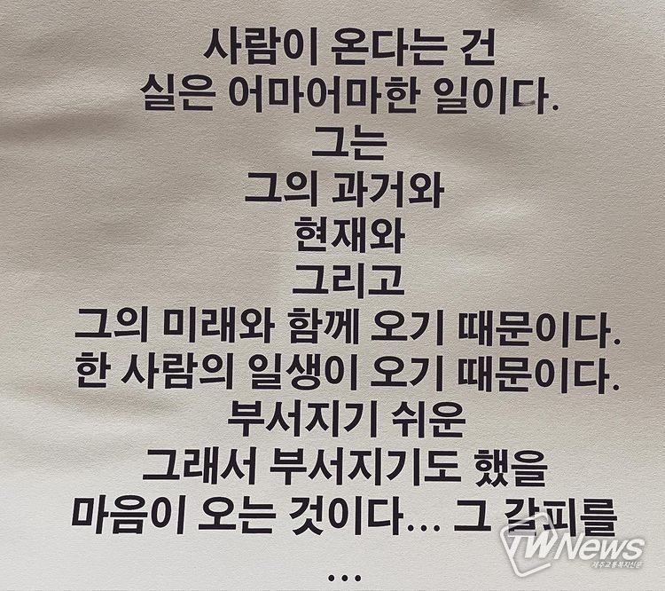 그는 이어서 “세대는 다르지만 한 시대를 살아가고 있는 너희를 운명처럼 만나 새로운 것들을 창조하고 함께 공부할 수 있다는 사실은 진실로 영광된 일”이라며 “나는 당신들의 존재로 이미 충만해. 내 안에 또 다른 가능성들을 발견하게 되어 감사하다”라고 인사를 전했다.