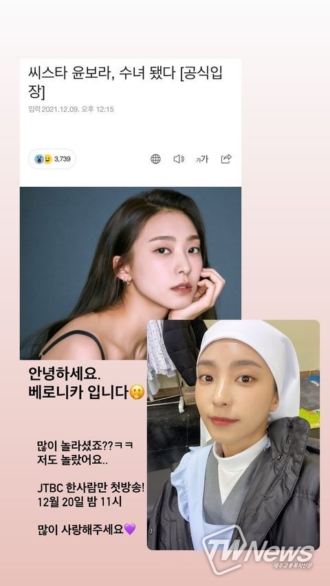9일 윤보라는 자신의 인스타그램 스토리를 통해 한 장의 이미지를 공개했다. 해당 이미지에는 새 드라마 관련 보도 사진 및 수녀복을 입은 자신의 모습이 담겼다.