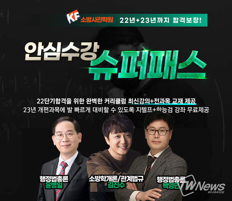 [제주교통복지신문 신혜정 기자] 2023년도에는 소방공무원 시험 과목 중 영어와 한국사 과목이 검정제로 대체될 것으로 예정된 가운데, 9급소방공무원 1위 소방사관학원이 2022년도 소방시험 부터 2023년도 소방공무원 시험까지 대비할 수 있는 ‘안심수강 슈퍼패스’ 를 제공한다고 밝혔다.
