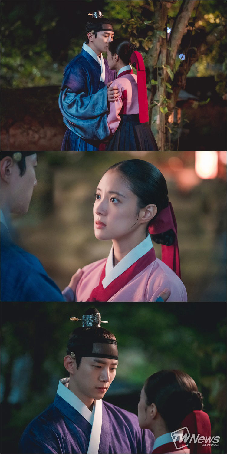 이 가운데 ‘옷소매’ 측이 10회 방송을 앞두고 공개한 스틸에는 산과 덕임이 은은한 달빛이 감도는 동궁의 별당에서 단 둘만의 시간을 보내는 모습이 담겨있다. 무엇보다 덕임의 이마에 입을 맞추고 있는 산의 모습이 시선을 강탈한다. 산은 덕임의 양 어깨를 두 손으로 단단히 감싸 쥔 채 입을 맞추고 있는데, 그런 산을 밀어내지 않는 덕임의 모습에서 두 사람의 관계 변화가 느껴지는 듯 하다. 또한 덕임의 얼굴을 바라보는 산의 뜨거운 눈빛, 일렁이는 감정이 느껴지는 덕임의 표정이 보는 이의 심박수를 수직 상승시킨다. 이에 ‘산덕커플’의 이마 키스와 함께 로맨틱한 명장면의 탄생을 예고하고 있는 ‘옷소매’ 본 방송에 기대감이 수직 상승한다.