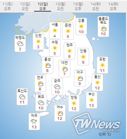 낮 기온은 1~12도로 (11일, 낮최고기온 9~11도)과 비슷하거나 낮겠다.