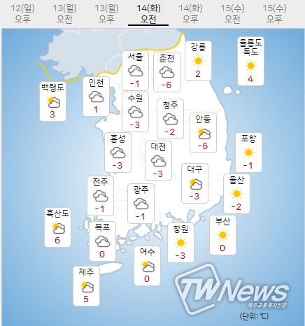 (14일) 아침최저기온은 서울 -1도, 인천 1도, 수원 -3도 등 -7~1도, 낮최고기온은 서울 7도, 인천 9도, 수원 7도 등 4~9도가 되겠다.