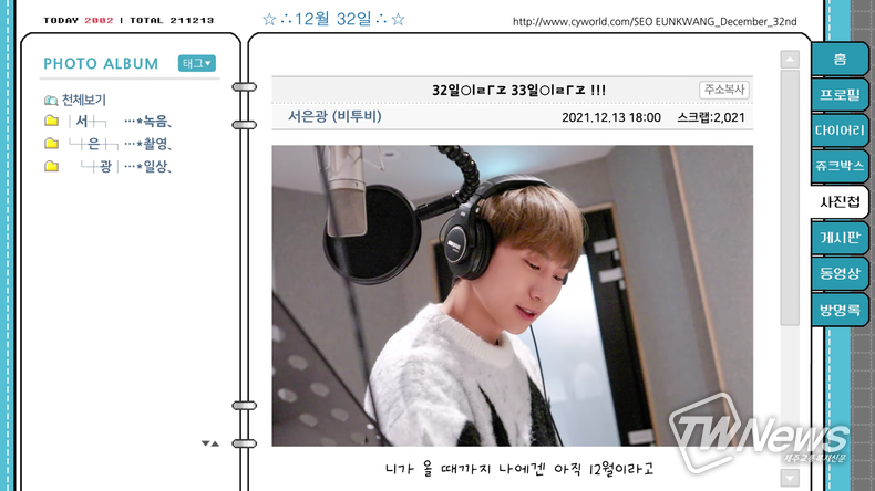 한편 ‘싸이월드 BGM 2021’의 열여섯 번째 리메이크 음원 ‘12월 32일’이 13일 오후 6시 전 온라인 음원 사이트를 통해 발매된다. 동시에 싸이월드 공식 유튜브 채널(Cyworld_Official)에서 뮤직클립이 독점 공개된다.