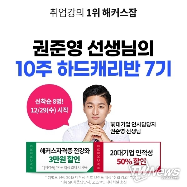 [제주교통복지신문 신혜정 기자] 취업 준비에 어려움을 겪는 취준생들을 위해 해커스 취업아카데미에서 ‘권준영 선생님의 10주 하드캐리반’을 선보였다.