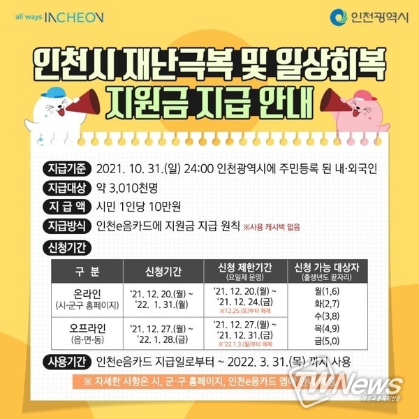 일상회복지원금은 지난 10월 말 기준 인천에 거주하는 모든 내외국인에게 1명당 10만원씩 지급되고, 인천이음 충전금보다 우선 사용된다.