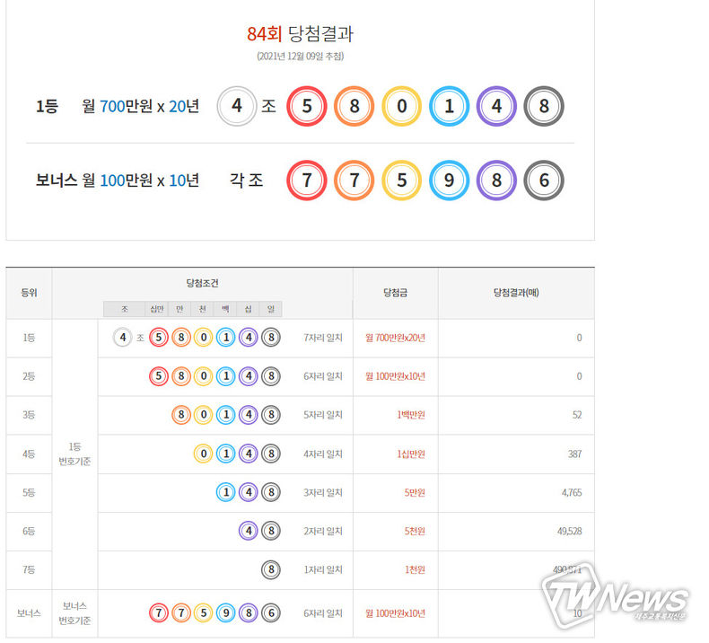 [제주교통복지신문 최효열 기자] 지난주 연금복권720+당첨확인 84회차 1등 당첨번호는 " 4조 580148 "이다. 보너스번호는 " 각조 775986 "이다.