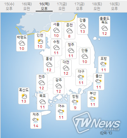 (16일) 아침최저기온은 10~11도(평년 4~6도), 낮최고기온은 13~16도(평년 11~13도)가 되겠다.