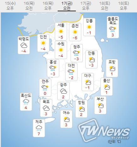 (17일) 아침최저기온은 서울 -5도, 인천 -4도, 수원 -4도 등 -8~-4도, 낮최고기온은 서울 -3도, 인천 -3도, 수원 -2도 등 -4~-1도가 되겠다.
