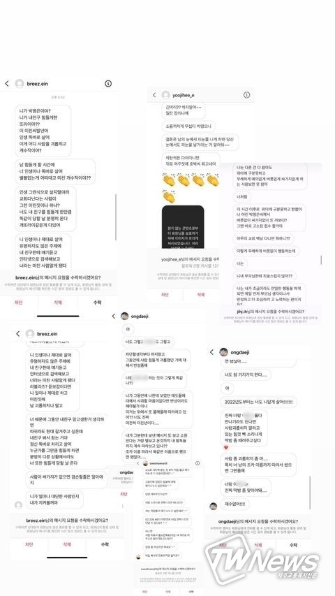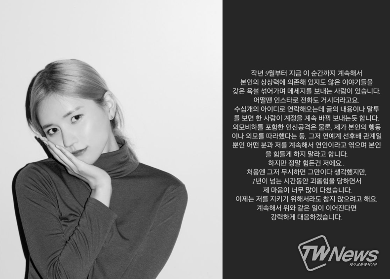 이어 “외모비하를 포함한 인신공격은 물론, 제가 본인의 행동이나 외모를 따라했다는 둥. 그저 연예계 선후배 관계일 뿐인 어떤 분과 저를 계속 연인이라고 엮으며 본인을 힘들게 하지 말라고 한다. 하지만 정말 힘든 건 나다”라고 그간의 힘들었던 속내를 전했다.