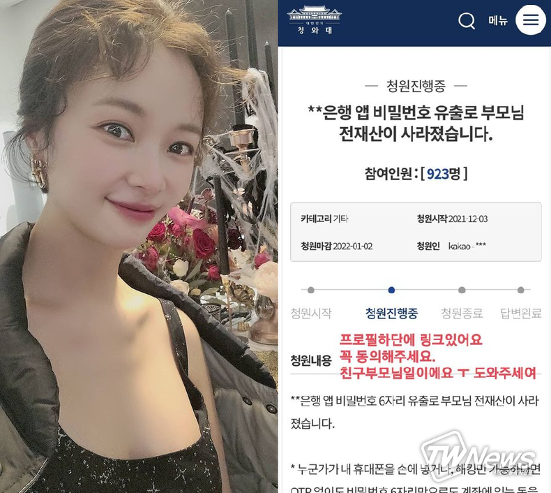 해당 이미지는 국민청원 내용을 캡처한 것으로, “**은행 앱 비밀번호 유출로 부모님 전 재산이 사라졌습니다”라는 제목의 글이었다. 황정음은 “프로필 하단에 링크 있어요. 꼭 동의해주세요”라며 친구를 위해 나섰다.