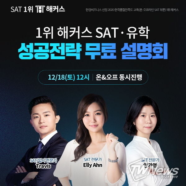 [제주교통복지신문 신혜정 기자] 내년 미국 대입을 위해 SAT 시험과 대입 준비를 미리 하는 수험생이 늘어나고 있는 가운데, SAT 학원 해커스가 ‘SAT·유학 전략 설명회’를 개최한다고 밝혔다.