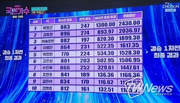 지난 16일 방송된 ‘내일은 국민가수’에서는 결승전 1라운드 결과를 발표하던 중 화면 입력 오류가 발생했다.